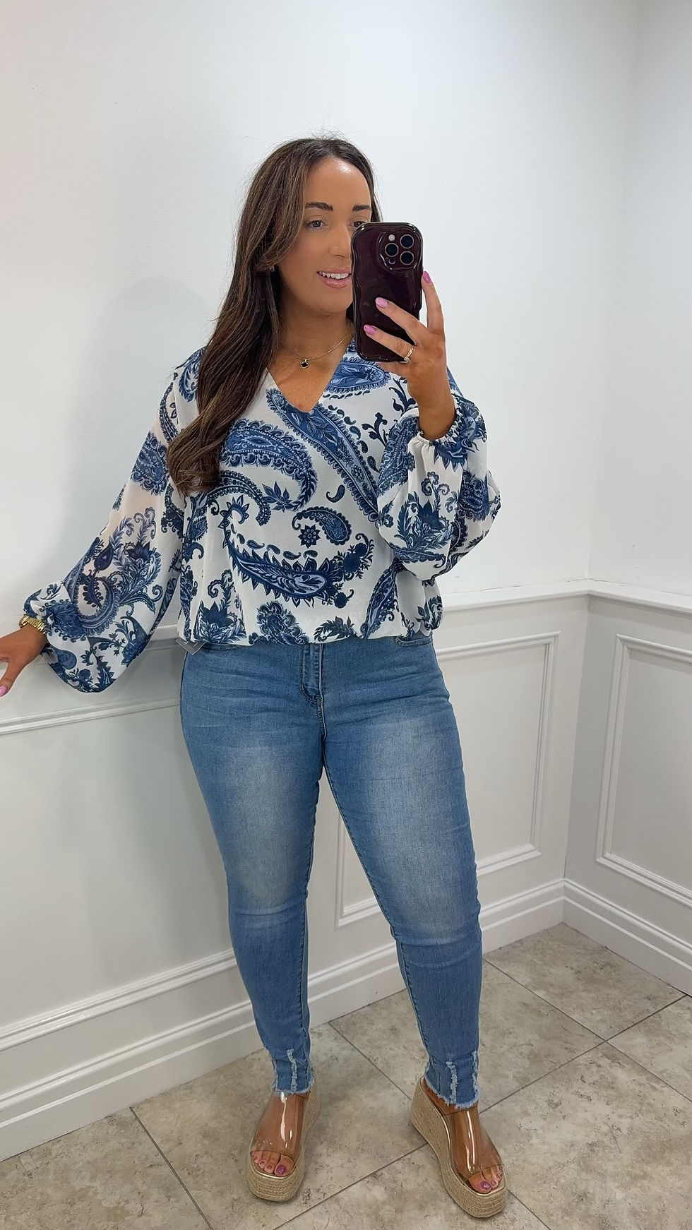 Meadow V Neck Printed Bubble Hem Top Paisley Navy
