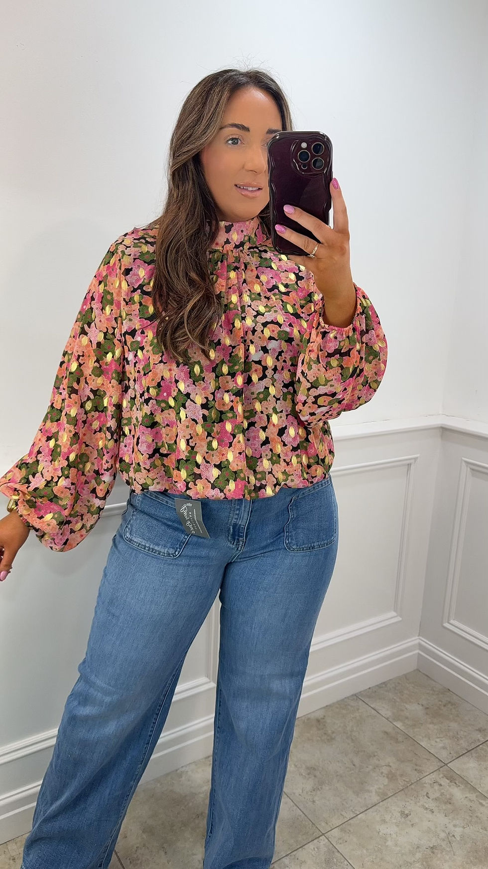Florence High Neck Shimmer Bubble Hem Top Flower Pink
