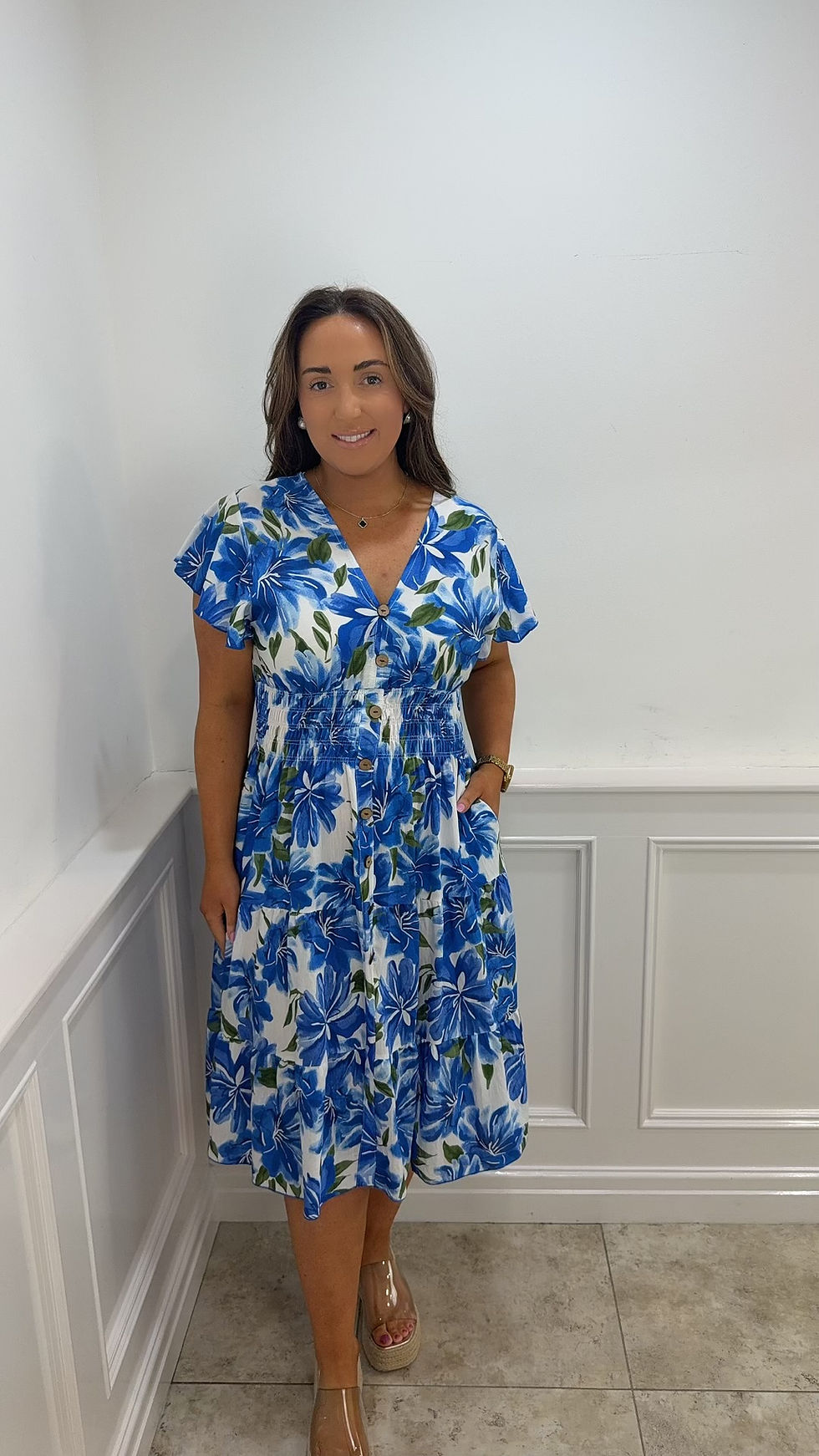 Shelby V Neck Button Floral Magic Midi Dress Blue