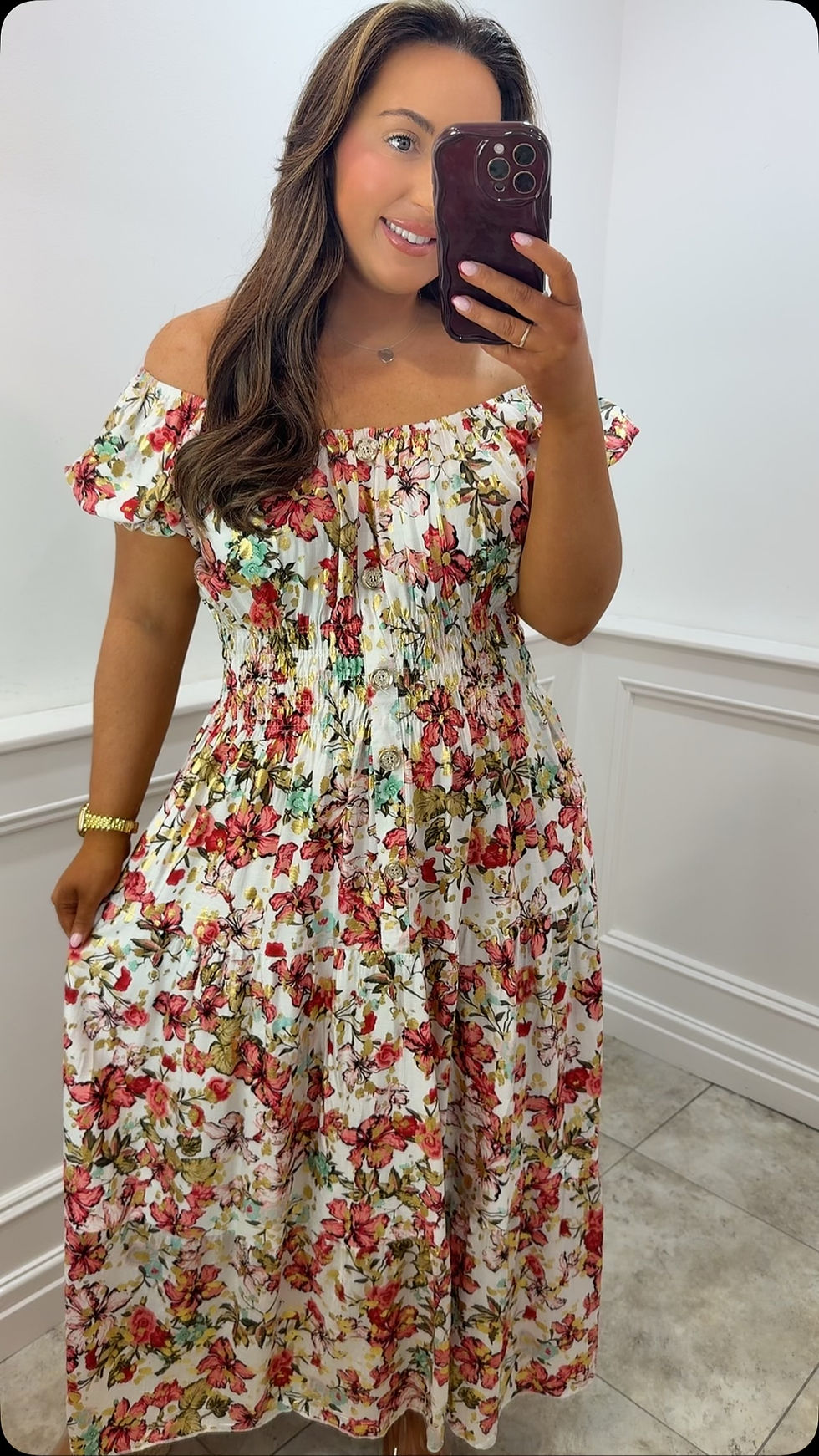 Ellenor Foil Printed Gold Button Magic Maxi Dress Floral Red