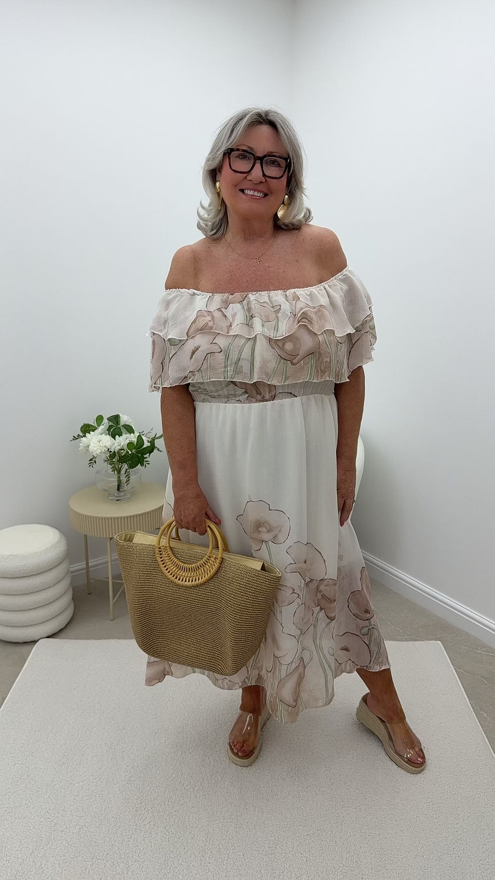Esther Floral Bardot Midaxi Dress Beige