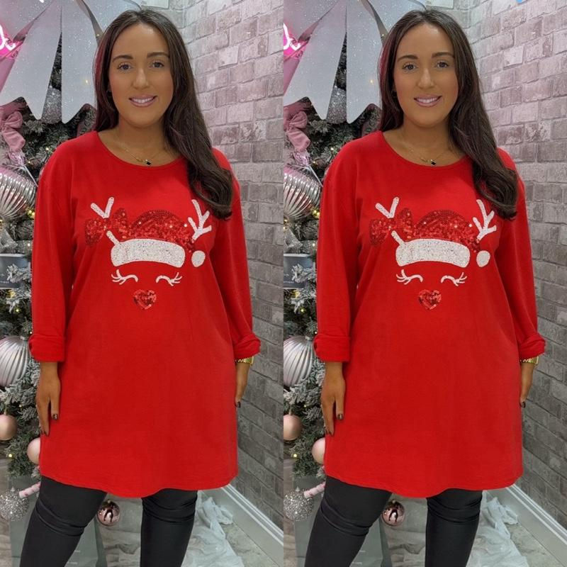 Nina Festive Detail Christmas Sequin Swing Top Reindeer Red