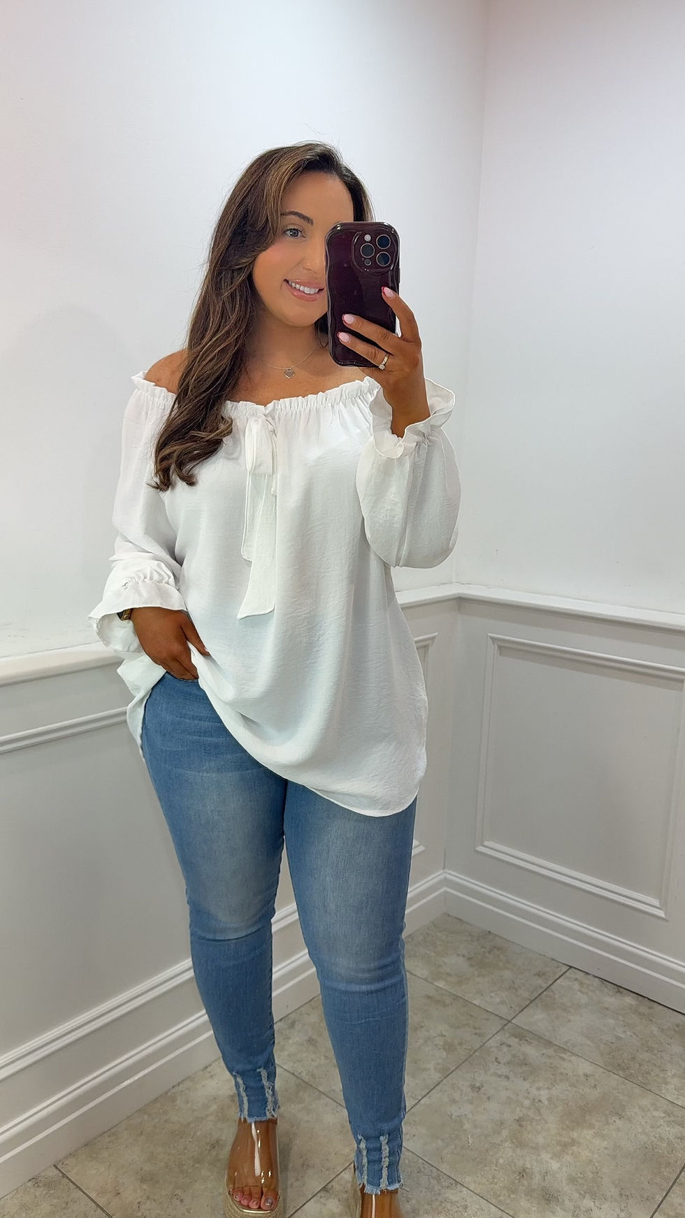Daphnie Curve Bardot Frill Top White